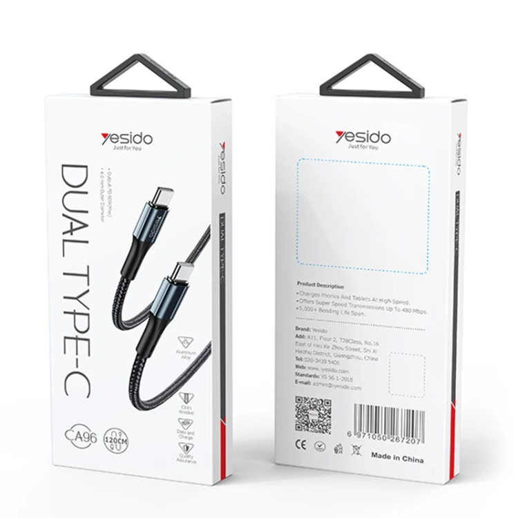 با پیشرفت تکنولوژی همچنان کابل های ایمن ترین و سریع ترین راه برای شارژ و انتقال اطلاعات برای گوشی های همراه می باشد. کمپانی خوش نام Yesido با ساخت کابلی با کیفیت این امکان را برای کاربران خود به وجود آورده تا بتوانند به راحتی گوشی همراه خود را با سرعت بالا و با اطمینان خاطر شارژ کرده و به انتقال اطلاعات میان دو گوشی موبایل و یا لپ تاپ نمایند. کابل Yesido CA96 به شما این امکان را می دهد تا بتوانید گوشی موبایل خود را با قدرت 60 وات شارژ کنید که سرعت فوق العاده برای شارژ محسوب می شود. طول این کابل 120 سانتی متر بوده که برای استفاده های روزمره بسیار مناسب می باشد.با استفاده از این محصول می توانید میان دیوایس خود و یک موبایل یا لپ تاپ مجهز به پورت Type-C به انتقال اطلاعات با سرعت بالا بپردازید. کمپانی یسیدو برای جلوگیری از گره خوردن ، کشش و پارگی این کابل بر روی آن روکشی از الیاف در هم تنیده کشیده ، که علاوه بر مقاومت بالا ، باعث زیبایی آن هم شده است. این کابل به شما این امکان را هم می دهد تا بتوانید به راحتی علاوه بر شارژ ، اطلاعات خود را هم با سرعت بالا انتقال دهید. در ادامه سوکت های این محصول دارای پوشش آلومینیومی جهت حفاظت در برابر ضربه و قسمتی سیلیکونی جهت حفاظت در برابر تا شدن قرار داده شده است تا آسیبی به آن وارد نشود.