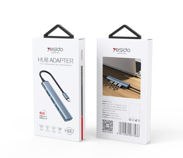 هاب تایپسی 4 پورت USB مدل HB17 محصولی از شرکت یسیدو است . خروجی پورت های USB در این محصول به صورت یک عدد USB3.0 و سه عدد USB2.0 است. سرعت انتقال اطلاعات توسط پورت USB3.0 این هاب تایپسی برابر 5GBPS است. سرعت انتقال اطلاعات توسط پورت USB2.0 برابر با 480 MPBS است.