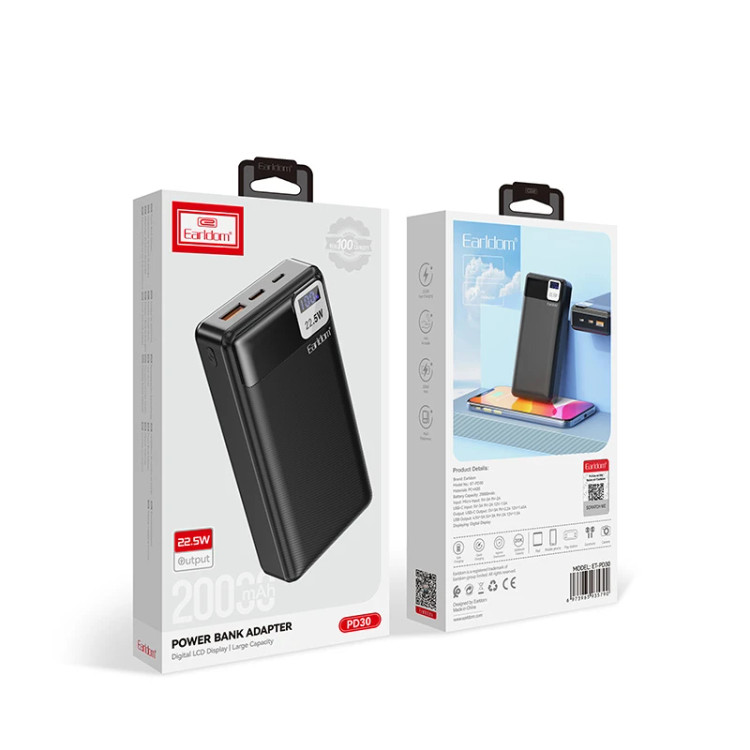 پاوربانک ارلدام PD30 یکی از جدید ترین مدل های این برند است که پاوربانکی قدرتمند و کامل به حساب می آید. خروجی این مدل ، 22.5 وات است. بر روی پنل جلویی ، یک LCD برای نمایش درصدی میزان شارژ پاوربانک ، قرار دارد که جلوه ای حرفه ای نیز به پاوربانک بخشیده است. در بالای پاوربانک 3 درگاه جای گرفته است ؛ USB ، PD (Type-C) و MicroUSB. درگاه USB دارای خروجی حداکثری 4.5 آمپر است که برای شارژ نمودن طیف گسترده ای از انواع موبایل ، تبلت ، هدفون و ... ایده آل است. درگاه تایپ سی از نوع PD است یعنی در واقع هم می تواند درگاه خروجی باشد و شارژ بدهد و هم از طریق این درگاه پاروبانک را به صورت شارژ سریع ، شارژ نمود. حداکثر شدت جریان این درگاه نیز در حدود 3.0 آمپر است. درگاه MICROUSB ( اندرویدی ) ، 1 درگاه ورودیست و می توان ازین طریق ، پاوربانک را شارژ نمود. درون بسته بندی ، 1 عدد کابل پاوربانک تایپ ی نیز جای گرفته است.